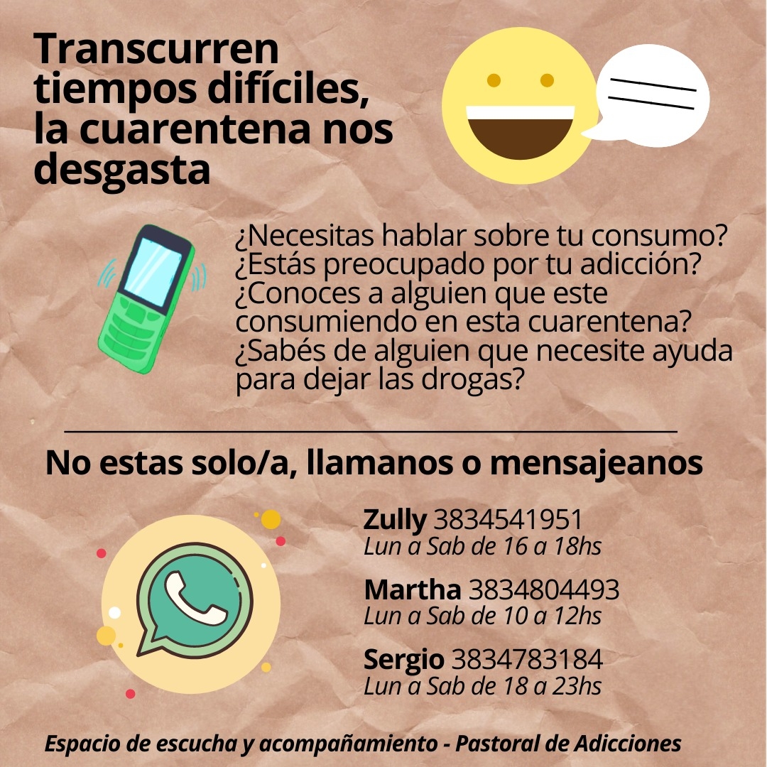 Los integrantes del Equipo de la Pastoral manifestaron que “ante este escenario, entendemos que el desafío es prevenir, en primer lugar, y acompañar y orientar, si ya hay consumo. La escucha, como herramienta de prevención y de contención y acompañamiento, es una respuesta que el Equipo ofrece a esta problemática. Están invitados a utilizar este servicio, los adolescentes, jóvenes y adultos que estén iniciando un camino de consumo o ya estén comprometidos en él. También, los familiares y amigos de hermanos adictos”.