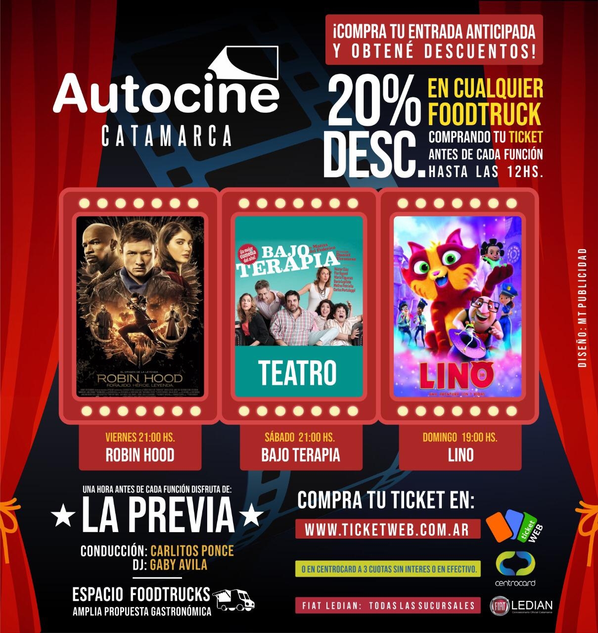 En esta nueva cartelera se podrá comprar la entrada anticipada obteniendo un beneficio de 20% de descuento para consumir en los Food Truck. Este beneficio se otorgará a las personas que adquieran la entrada vía web hasta las 12 horas del día de la función.
