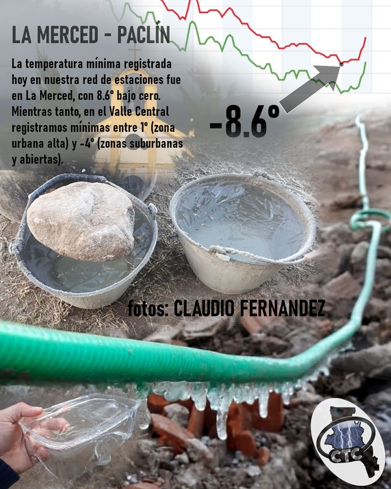 De acuerdo al registro de los Cazadores de Tormentas de Catamarca, la mañana de este viernes despertó con 8.6°C bajo cero en la estación de La Merced, Paclín.