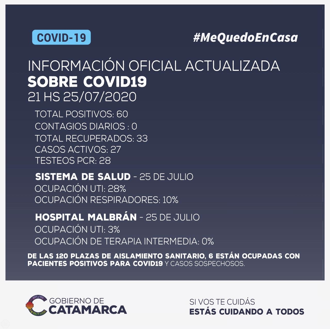 Hasta las 21 horas del sábado 25 de julio, no se han detectado nuevos casos positivos de coronavirus en la provincia de Catamarca. El total acumulado de casos positivos detectados se mantiene en 60.