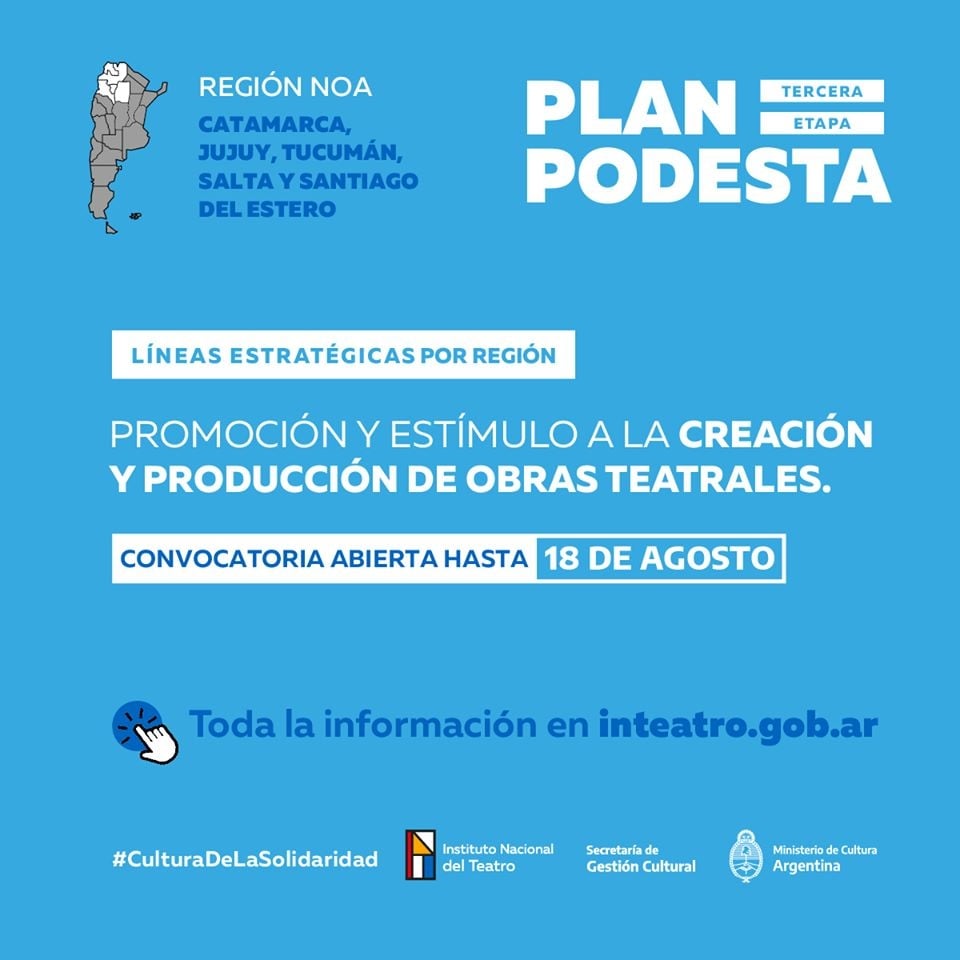 Este aporte especial fue aprobado por el Consejo de Dirección del Instituto Nacional del Teatro en el marco de la tercera etapa del Plan para la Preservación Operativa de Elencos, Salas y Teatristas Argentinos (PODESTA), con el objetivo de continuar dando respuesta a la situación de fragilidad en la que se encuentran las diversas comunidades teatrales de país.