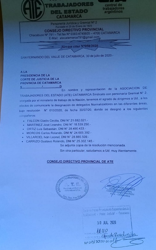 "En nombre y representación de la Asociación de Trabajadores del Estado (ATE) Catamarca, sindicato con Personería Gremial Nro. 2, otorgada por el Ministerio de Trabajo de la Nación, tenemos el agrado de dirigirnos a Ud., a los efectos de comunicarle la designación de delegados normalizadores en las diferentes áreas, bajo Resolución Nro. 013/2020, de fecha 30/07/20, donde se designó a los siguientes compañeros: Gladis Cecilia Falcón, José Leandro Martínez, Luis Sebatián Ortíz, Carlos Rolando Morcos, Iván Leonel Villarroel y Gustavo Rolando Carrizo.