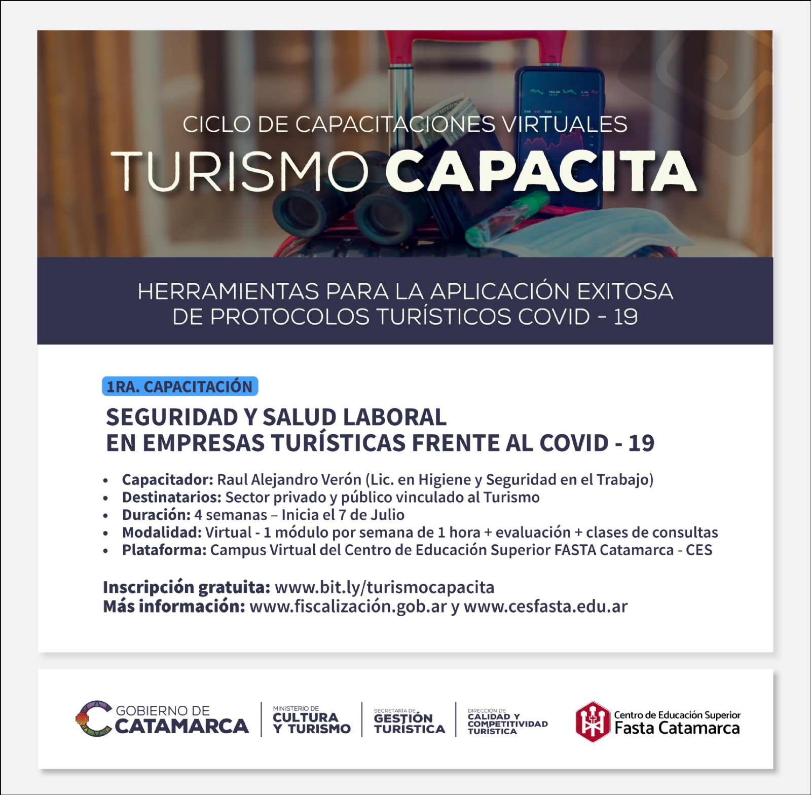 La primera de estas capacitaciones será “Seguridad y Salud Laboral en Empresas Turísticas frente al Covid 19”. Este curso se realiza en conjunto con el Centro de Estudios Superiores FASTA Catamarca y estará a cargo del Lic. en Higiene y Seguridad en el Trabajo, Raúl Alejandro Verón, quien es Egresado de la Universidad F.A.S.T.A. con experiencia en sistema de gestión del trabajo seguro y programas de seguridad en empresas nacionales y multinacionales.