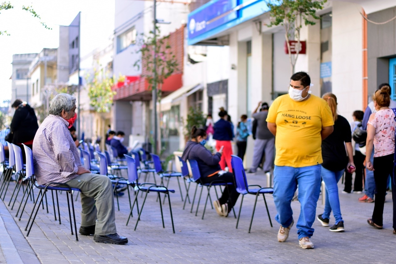 En los casos de mayor concentración de personas, especialmente jubilados y pensionados, se cortan las calles para ofrecer una cómoda espera a los adultos mayores, y previamente se realiza un completo lavado de veredas, como en todo el microcentro.