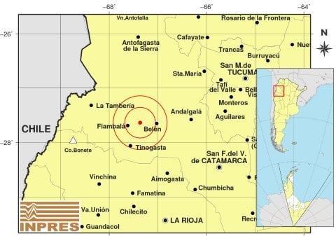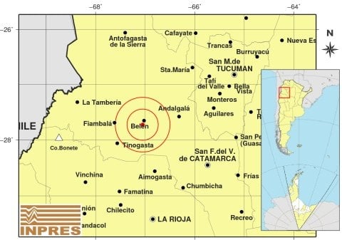 Epicentro: 152 km al NO de San F. Del Valle De Catamarca; 188 km al N de La Rioja; 9 km al S de Belén -27.726 (lat) -67.052 (long)
