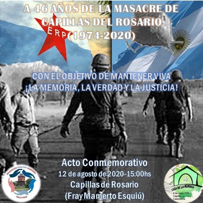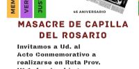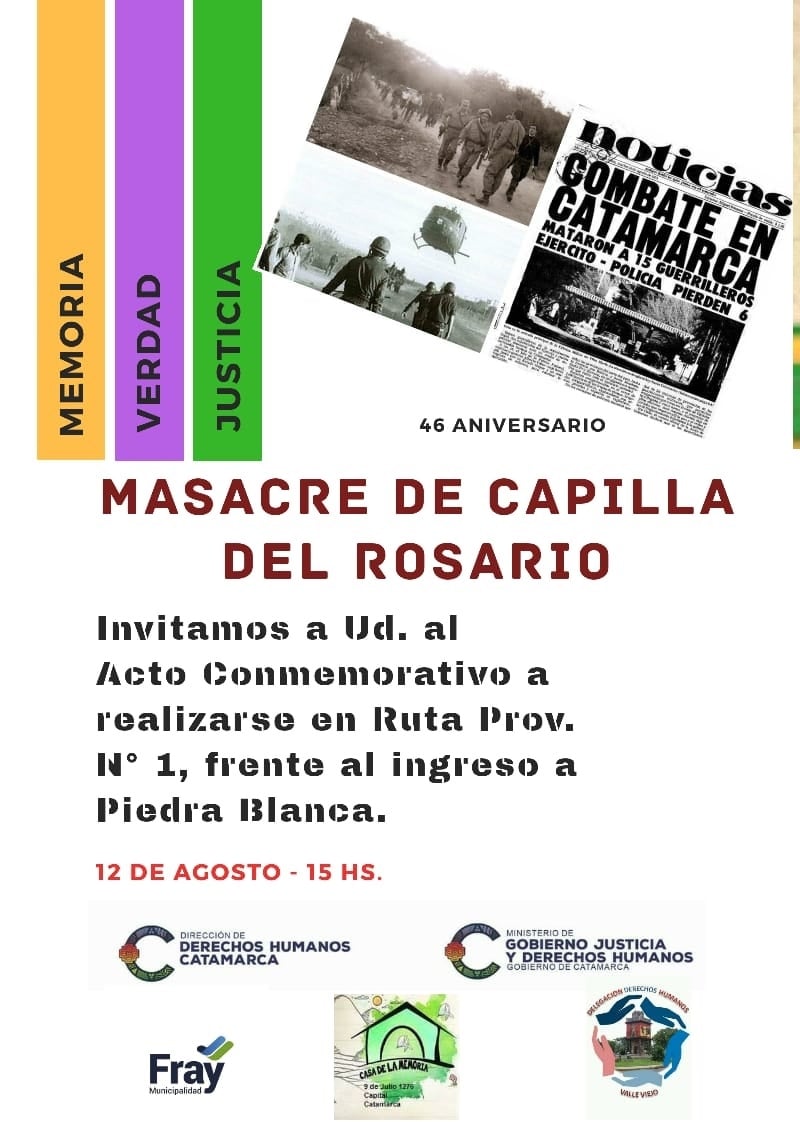 Bajo la consigna de "Memoria, Verdad y Justicia", la "Casa de la Memoria" de Catamarca evocará hoy el 46° Aniversario de la "Masacre de Capilla del Rosario", con un acto que, a las 15 hs., tendrá lugar sobre la Ruta Provincial Nro. 1, en el acceso a Piedra Blanca (FME).