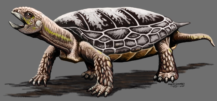 A partir de estos cuatro especímenes, se pudo reconstruir gran parte de su caparazón, de su cintura pélvica, de su cintura escapular (lo que sería la articulación de su hombro) y parte de su cráneo. Este animal existió a fines del Triásico, ya muy cerca del límite con el periodo Jurásico que comenzó hace unos 200 millones de años.