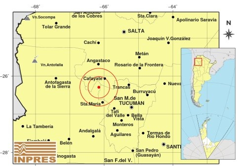 Epicentro: 111 km al NO de San Miguel De Tucumán; 179 km al SO de Salta; 31 km al SO de Cafayate -26.296 (lat) -66.155 (long)