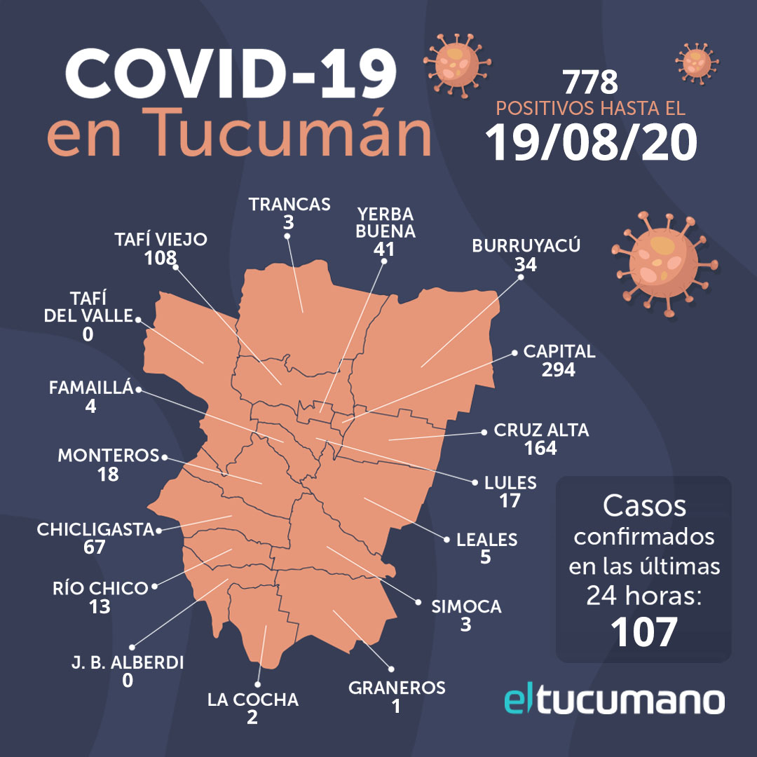 Este miércoles, Tucumán registró 107 nuevos casos de Coronavirus: 92 por la mañana y otros 15 por la tarde. De esta forma, sumen en total 778 las muestras positivas detectadas mediante laboratorio, desde el 19 de maro, de personas residentes en territorio tucumano.