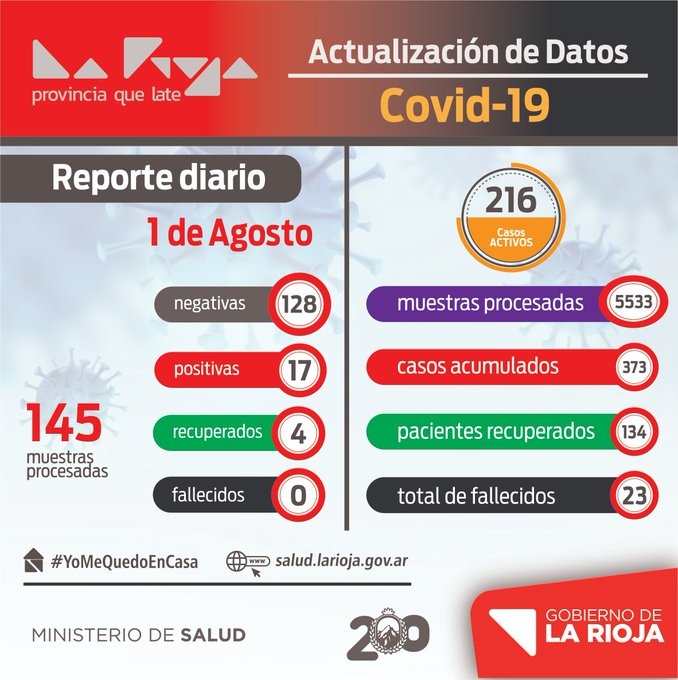 El ministerio de salud de La Rioja dio a conocer el segundo informe covid-19 del sábado 1/08. En la ocasión se procesaron 89 muestras, resultando 76 negativas y 13 positivas para COVID-19.