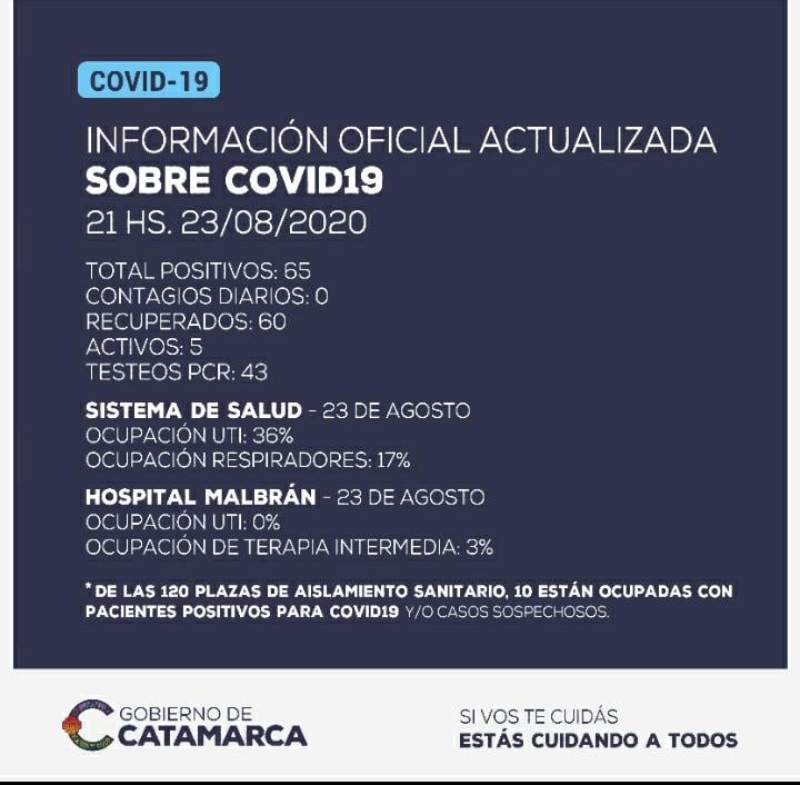 Hasta las 21 horas del domingo 23 de agosto, no se han detectado nuevos casos positivos de coronavirus en la provincia de Catamarca. El total acumulado de casos positivos detectados se mantiene en 65. Hoy no se registraron nuevos pacientes recuperados.