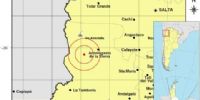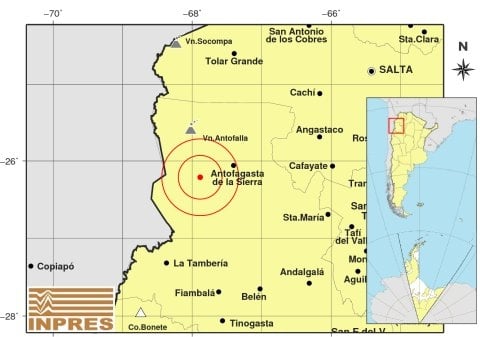 Epicentro: 276 km al O de San Miguel De Tucumán; 292 km al SO de Salta; 52 km al O de Antofagasta De La Sierra -26.212 (lat) -67.885 (long)