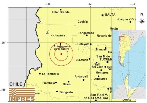 Epicentro: 219 km al O de San Miguel De Tucumán; 269 km al SO de Salta; 49 km al S de Antofagasta De La Sierra -26.488 (lat) -67.366 (long)