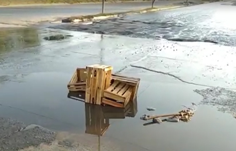 El hecho se registra en Avenida Manuel Navarro, en la zona sur de la ciudad, donde los vecinos tuvieron que colocar cajones de verduras para evitar mayores inconvenientes o siniestros viales por el tremendo bache que esconde el agua estancada.