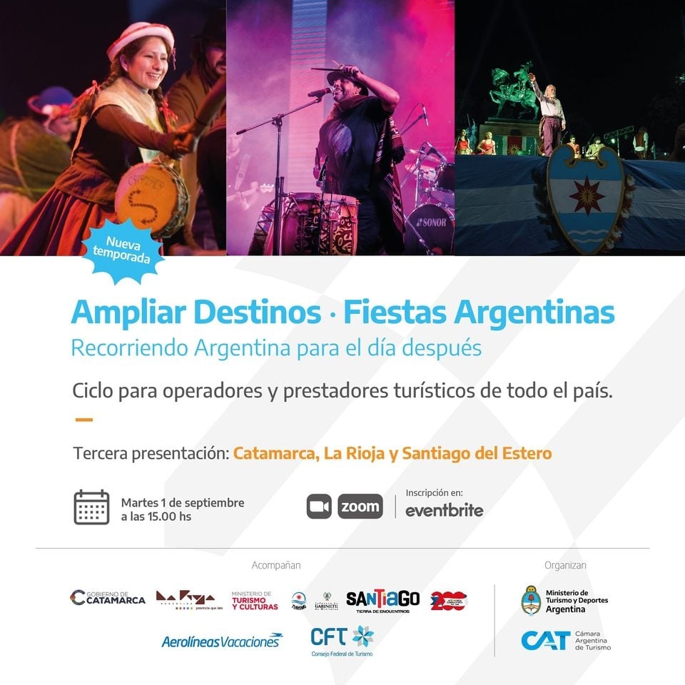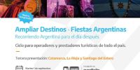 El de Fiestas Argentinas es el segundo ciclo de capacitaciones para prestadores turísticos que se impulsa bajo el nombre Ampliar Destinos. Del primero, realizado en julio pasado, Catamarca participó presentando su oferta turística antes más de 300 operadores del país, lo que constituyó un importante espacio de promoción para seguir posicionándola como destino para cuando sea posible la reactivación del turismo en el país.