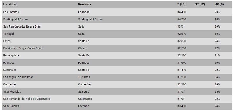 El ranking, según el Servicio Meteorológico Nacional, lo encabeza una localidad de la provincia de Formosa. San Fernando del Valle de Catamarca está ubicada en el puesto 13°. Son registros correspondientes a la hora 17.