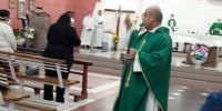 La ceremonia litúrgica dio inicio pasadas las 19.00 con la lectura del decreto correspondiente, tras lo cual el Obispo bendijo el agua con la que el nuevo párroco roció a los fieles. Antes de la proclamación del Evangelio, el P. Quiroga del Pino recibió el Evangeliario de manos de Mons. Urbanc.