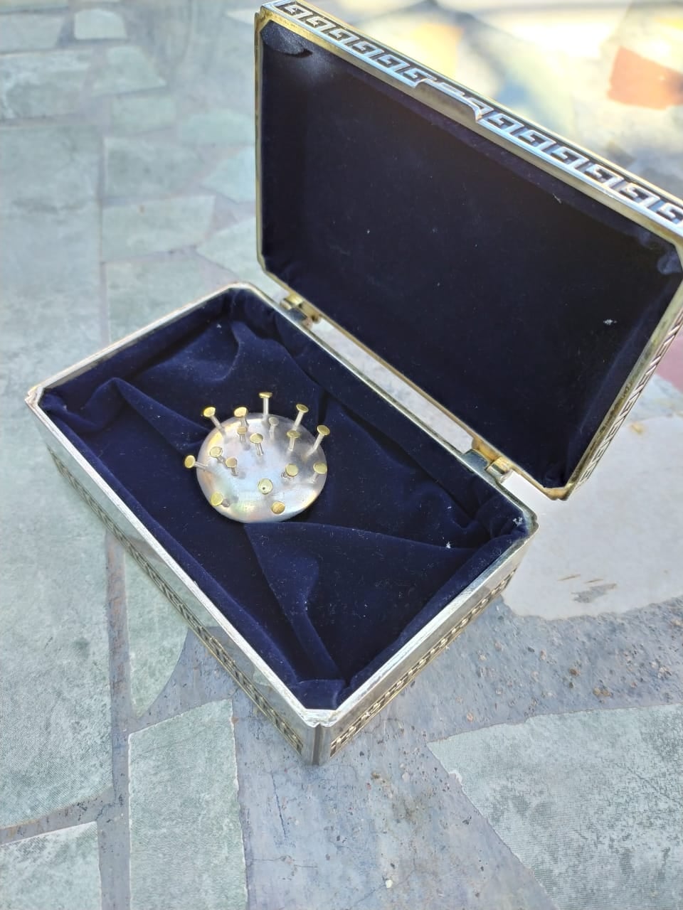 Este trabajo artesanal “hecho a mano, a golpes en el yunque, con las mismas herramientas que usaba mi padre”, le demandó “más o menos un mes”, dijo, y describió que “es de plata con detalles de oro y bronce, que es el dorado de arriba, tiene poco más de 30 milímetros de diámetro, aproximadamente, y pesa unos 16 gramos”.