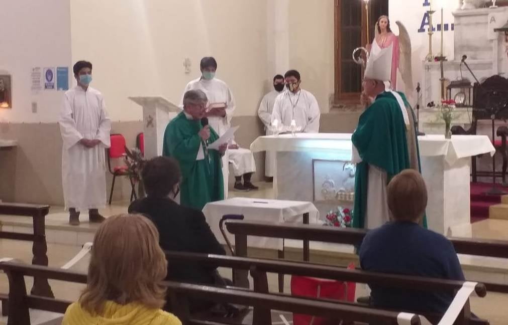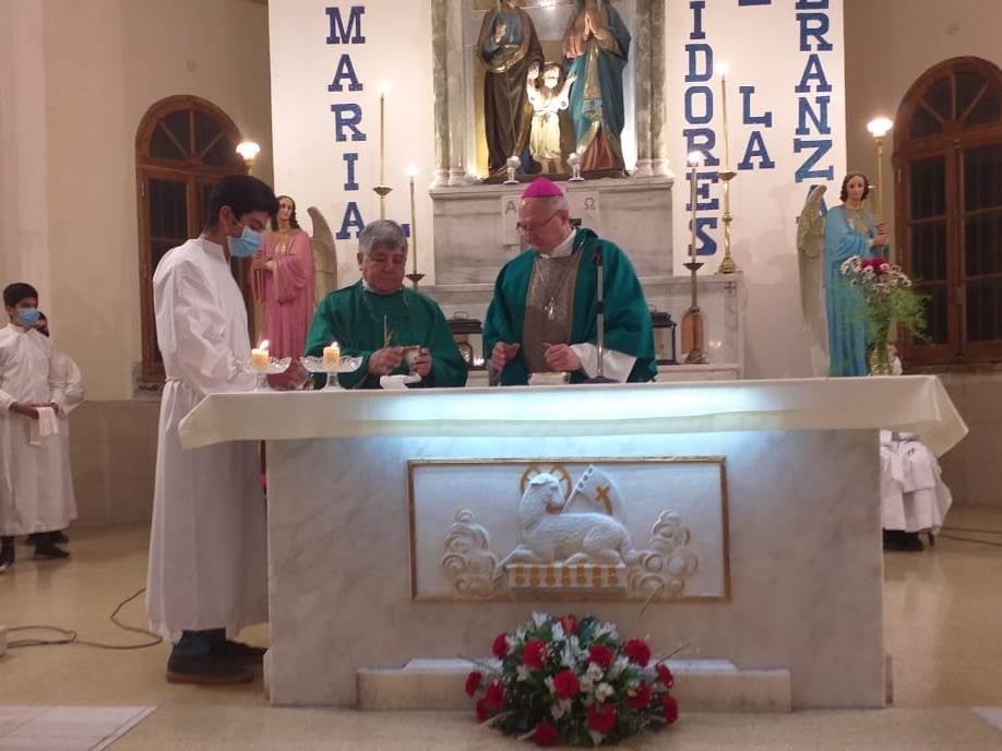 El Obispo Diocesano, Mons. Luis Urbanc, presidió la Santa Misa concelebrada por los Pbros. Pablo Batallán, Daniel Pavón, párroco saliente, y Eduardo López Márquez, quien tuvo a su cargo la lectura del decreto de designación del nuevo párroco.