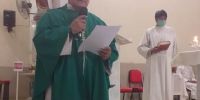 Luego de la bendición del agua por parte del Obispo, el Padre Batallán roció a los presentes, y antes de la proclamación de la Palabra de Dios recibió el Evangeliario de manos de Mons. Urbanc.