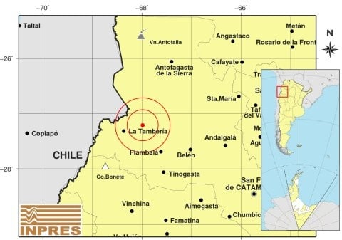 Epicentro: 260 km al NO de San F. Del Valle De Catamarca; 268 km al NO de La Rioja; 40 km al E de La Tambería -27.214 (lat) -67.988 (long)