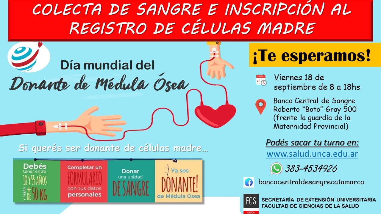Se invita a toda la comunidad universitaria y la comunidad catamarqueña en general a participar y revalorizar su acción altruista, que le posibilita a la provincia contar y disponer con sangre de forma segura y oportuna, para ayudar a otras personas que lo necesiten y además incrementar las posibilidades de encontrar una persona compatible a todas aquellas que hoy esperan un trasplante de Células Madre.