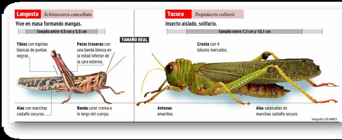 Por otra parte, en cuanto a la Langosta Tucura Quebrachera (Tropidacris collaris), que produce mayores daños en los cultivos y no viaja en mangas como la Sudamericana, sino que es solitaria y aparece en focos localizados puntualmente, desde el organismo informaron que se realizan intervenciones para combatirla en inmediaciones de Recreo y en la localidad de Trampasacha (Capayán).