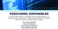 Se indica que las posiciones disponibles son para: DEV JAVA SSR/SR, DEV NET SSR/SR, DEV ANGULAR SSR/SR, DEV NODEJS SSR/SR, DEV REACT SSR/SR y QA AUTOMATION SSR/SR.