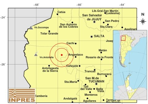 Epicentro: 165 km al SO de Salta; 210 km al NO de San Miguel De Tucumán; 57 km al O de Angastaco -25.604 (lat) -66.816 (long)