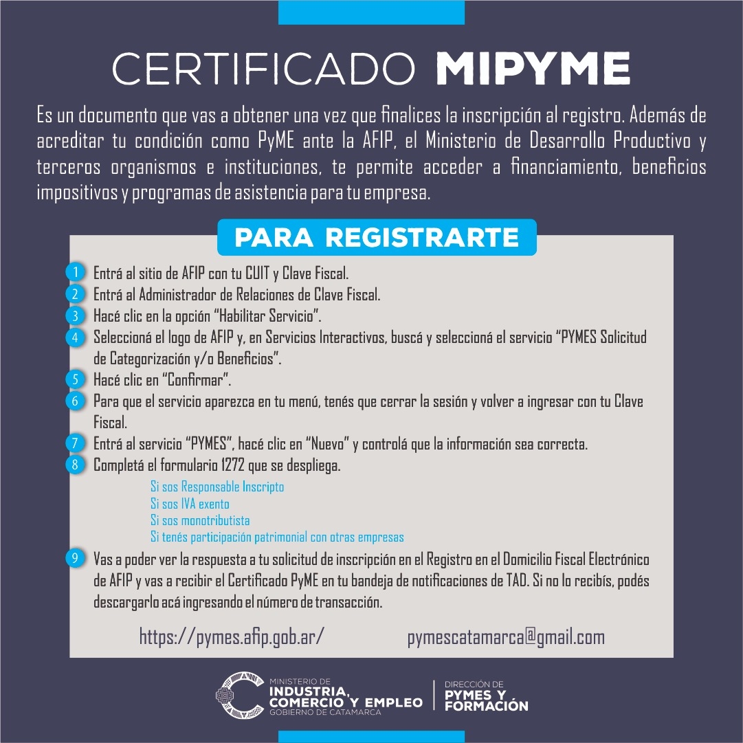 Además, los habilita para acceder a planes de financiamiento, beneficios impositivos y programas de asistencias a empresas, entre otros trámites.
