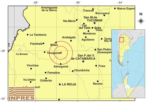 Epicentro: 111 km al O de San F. Del Valle De Catamarca; 146 km al N de La Rioja; 52 km al N de Aimogasta -28.089 (lat) -66.795 (long)