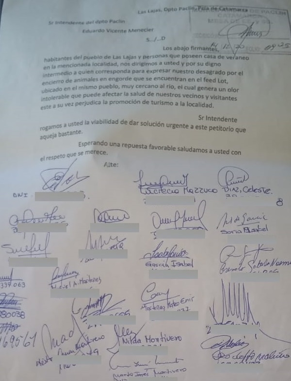 La nota lleva varias firmas, y en ella los pobladores advierten que el "Feedlot" puede afectar la salud de los vecinos y, a la vez, perjudica la promoción del turismo.