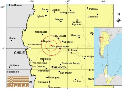 Epicentro: 54 km al SO de San Juan; 112 km al N de Mendoza; 48 km al O de Va.Media Agua -31.860 (lat) -68.910 (long)
