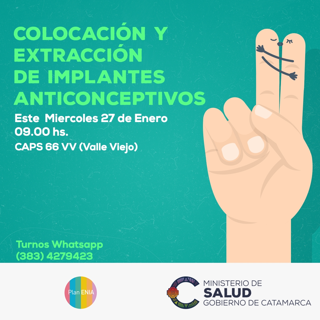 Este miércoles 27, a partir de las 9 horas, se llevará a cabo un operativo, conjuntamente con la municipalidad de Valle Viejo, en el CAPS de las 66 Viviendas; durante la jornada se realizará colocación y extracción de implantes.