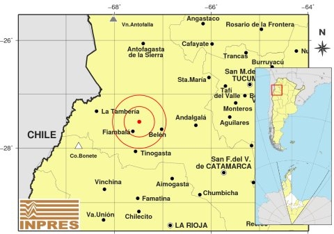 Epicentro: 201 km al NO de San F. Del Valle De Catamarca; 219 km al N de La Rioja; 23 km al NE de Fiambalá -27.515 (lat) -67.486 (long)