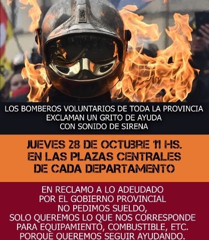 Por mandato de todos los bomberos de la provincia decidimos mañana hacer un sirenazo, en cada departamento. En el caso nuestro vamos a ir a la iglesia de San Isidro a pedir a que les ablande los corazones de los que tienen la responsabilidad, que hagan lo que tienen que hace y para lo que les están pagando, que agilizar una orden que ya esta echa. La semana que viene el día miércoles 3, nos vamos a movilizar a la capital. De la misma manera que nos llamaron, en el mes de julio para anunciarnos un subsidio que nunca llego y que fuimos todos a aplaudir, de la misma manera vamos a ir con las sierenas a que nos escuchen, iremos a la Cámara de Diputados que esta sesionando, para que los legisladores nos escuchen y que piensen como hacemos para el presupuesto que tienen que aprobar para el periodo 2022, este incluido con el monto para los bomberos y con fecha de pago no a pillar, esa plata que nos deben es para pagar deudas de combustible, comercios y demás. El equipamiento y los insumos para los cuarteles están dolarizados, no sabemos cuánto vale un par de guantes. Por ello el miércoles hay una movilización de todos los cuarteles, sin descuidar la operatividad de los mismos.