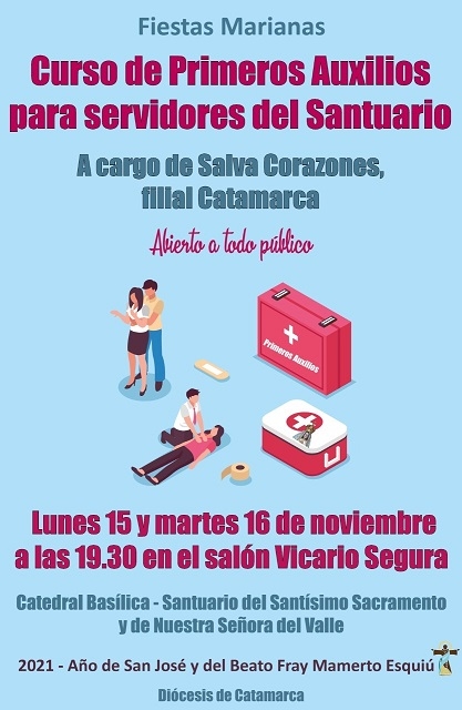 Los días lunes 15 y martes 16 de noviembre, la fundación Salva Corazones, filial Catamarca, brindará un curso de Primeros Auxilios destinado a los colaboradores del Santuario de la Virgen del Valle y a quienes deseen sumarse.