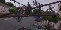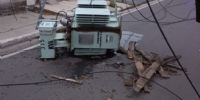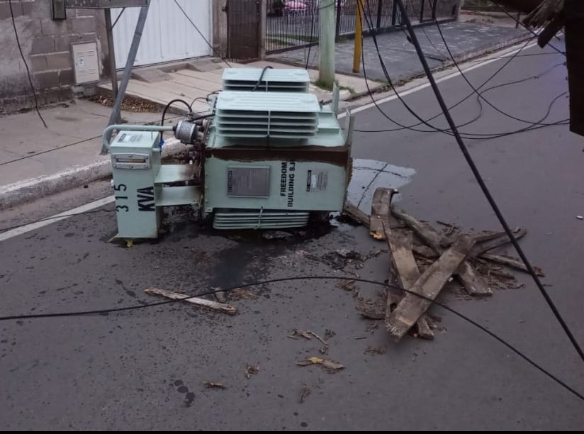 El transformador y el poste cruzan la calzada, donde es imposible transitar por el peligro latente. Trabaja personal de la EC SAPEM.