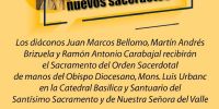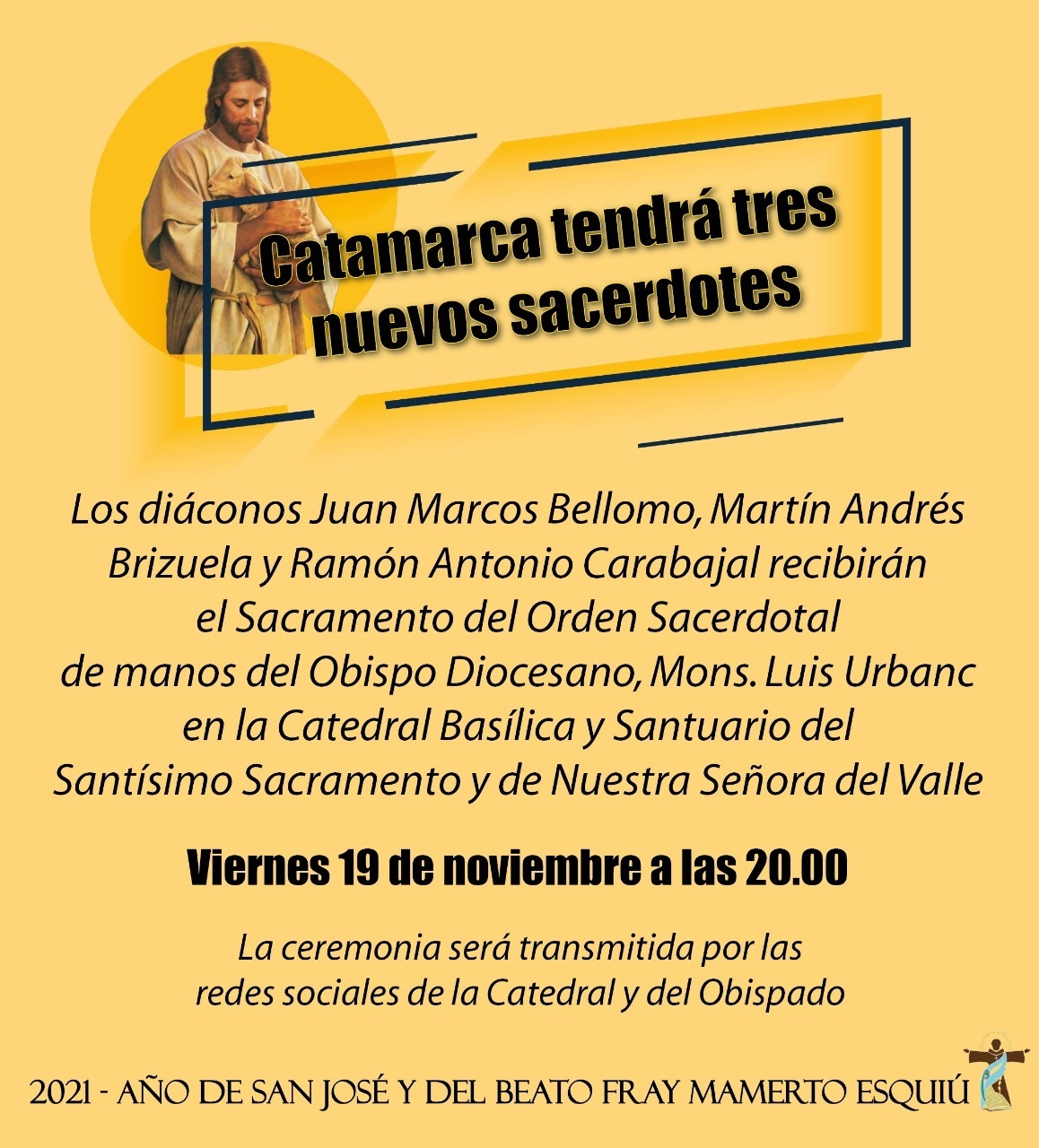 El viernes 19 de noviembre, a las 20, los diáconos Juan Marcos Bellomo, Martín Andrés Brizuela y Ramón Antonio Carabajal recibirán el Ministerio Sacerdotal de manos del Obispo Diocesano, Mons. Luis Urbanc. La Iglesia Diocesana de Catamarca se prepara con alegría y oración para recibir a los nuevos sacerdotes, quienes pasarán a formar parte del Clero catamarqueño.