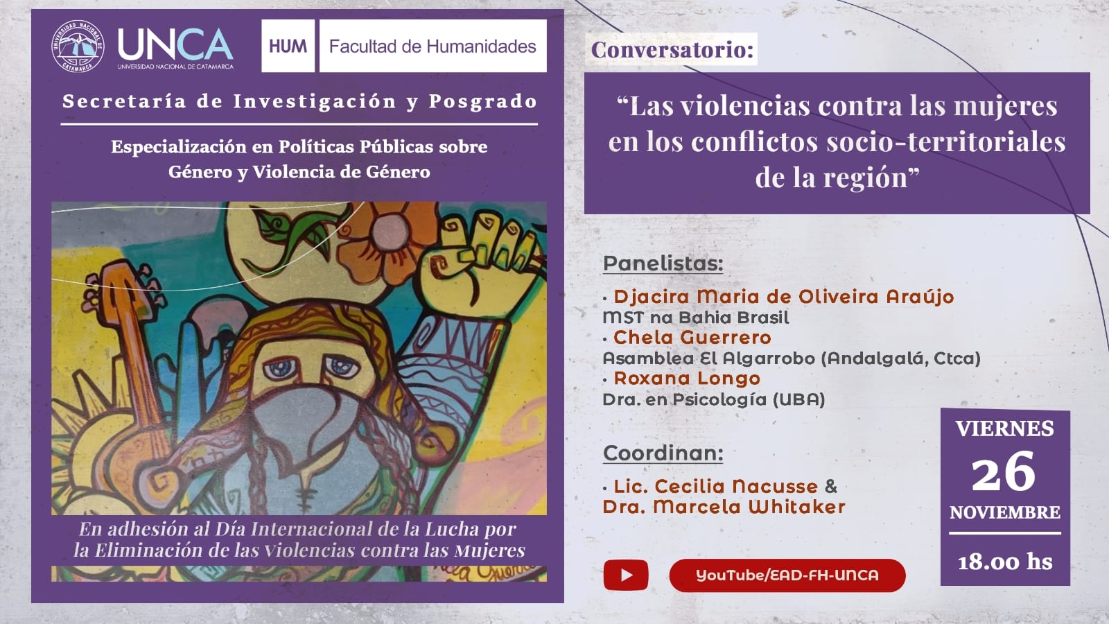 Una de ellas se desarrollará este viernes a las 18 horas y es organizada por la Secretaría de Investigación y Posgrado. El Conversatorio virtual: “Las violencias contra las mujeres en los conflictos socio territoriales actuales”, será transmitido por el canal de YouTube del Departamento de Educación a Distancia.