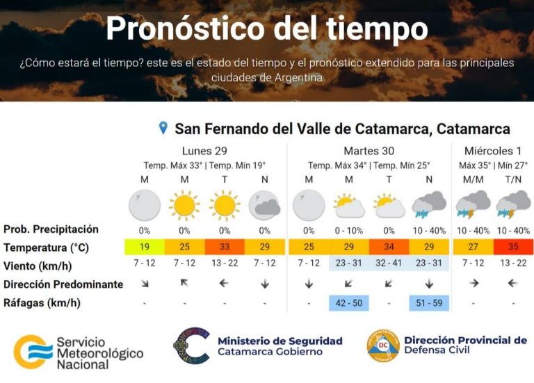 Se esperan temperaturas mínimas de 19 y máximas de 35°, vientos de entre 7 y 31km/h., ráfagas de entre 42 y 59 km/h. y, una probabilidad de ocurrencia de tormentas aisladas de entre 0% y 40%.
