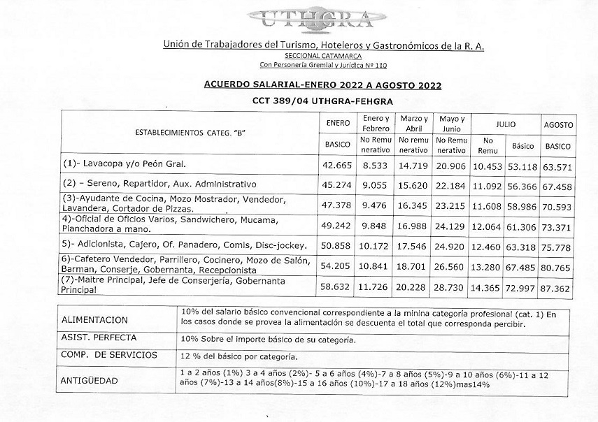 A todo esto, por el Convenio 401/05, que alcanza al personal de las empresas gastronómicas instaladas en los emprendimientos mineros del Salar del Hombre Muerto (Antofagasta de la Sierra) y Bajo La Alumbrera (Andalgalá), también se establecieron aumentos salariales a partir del mes de Enero/22, que van de $11.094 para un peón general o jardinero a $18.941 para el cargo de jefe de cocineros y nutricionista “C”.