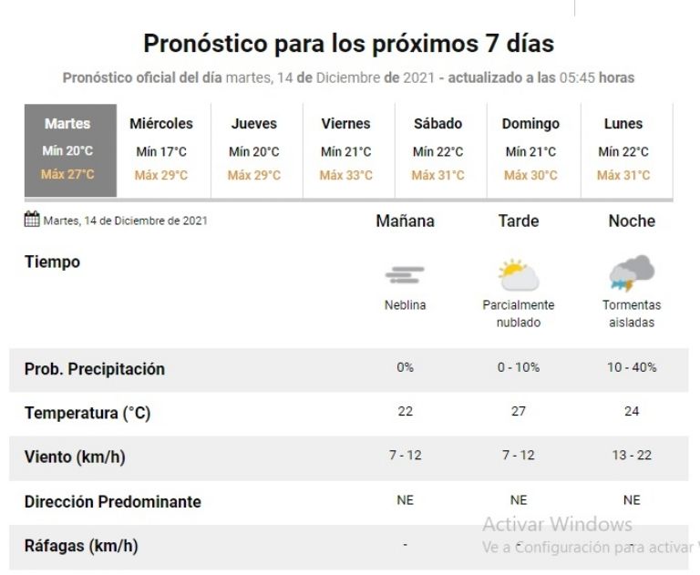 El pronóstico del SMN anuncia para hoy martes una máxima de 27ºC con ráfagas de viento entre 7 y 22 km./h. con cielo parcialmente nublado.