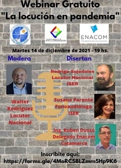 Contó con la presencia del actual delegado de ENACOM en Catamarca, quien habló sobre la situación de los medios locales en la actualidad y el estado de conectividad en el que se encuentra la provincia. También participaron dos profesores del ISER (Instituto Superior de Enseñanza Radiofónica) como el Locutor Nacional Rodrigo Sujodoles y la Fonoaudióloga Susana Parente, quienes disertaron sobre el correcto uso de la voz en pandemia.