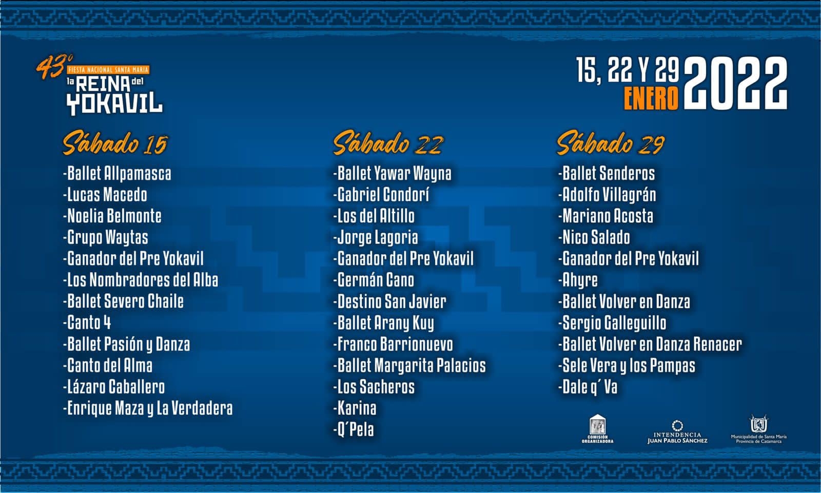 Entre lo más destacado, se anunció la Apertura de Temporada Turística, a realizarse el día 5 de enero, en el Anfiteatro Municipal; el 9 de enero el Pre Yokavil e Inicio de las Noches Culturales en el Playón de la Esc. Abel Acosta; 6, 7 y 8 de enero Gran Fiesta Deportiva de MTB (jueves 06 de enero: Short Track Volta y Nocturno infantil; Viernes 07 de enero: Trail Running El Churqui; Sábado 08 de enero Campeonato Argentino Nocturno en Parejas “Isidro Reyes”; 6, 7 y 8 de enero Expo Bici); 15, 22 y 29 de enero Fiesta Nacional Santa María la Reina del Yokavil; Sábado 22 y domingo 23 de enero Enduro Extremo; sábado 29 y domingo 30 Encuentro de Gauchos; 2 de febrero Celebración Religiosa, Fiesta de la Candelaria, patrona de la ciudad y Aniversario de Santa María, con la actuación del tenor catamarqueño Nicolás Romero acompañado por al artista nacional Nahuel Pennisi.