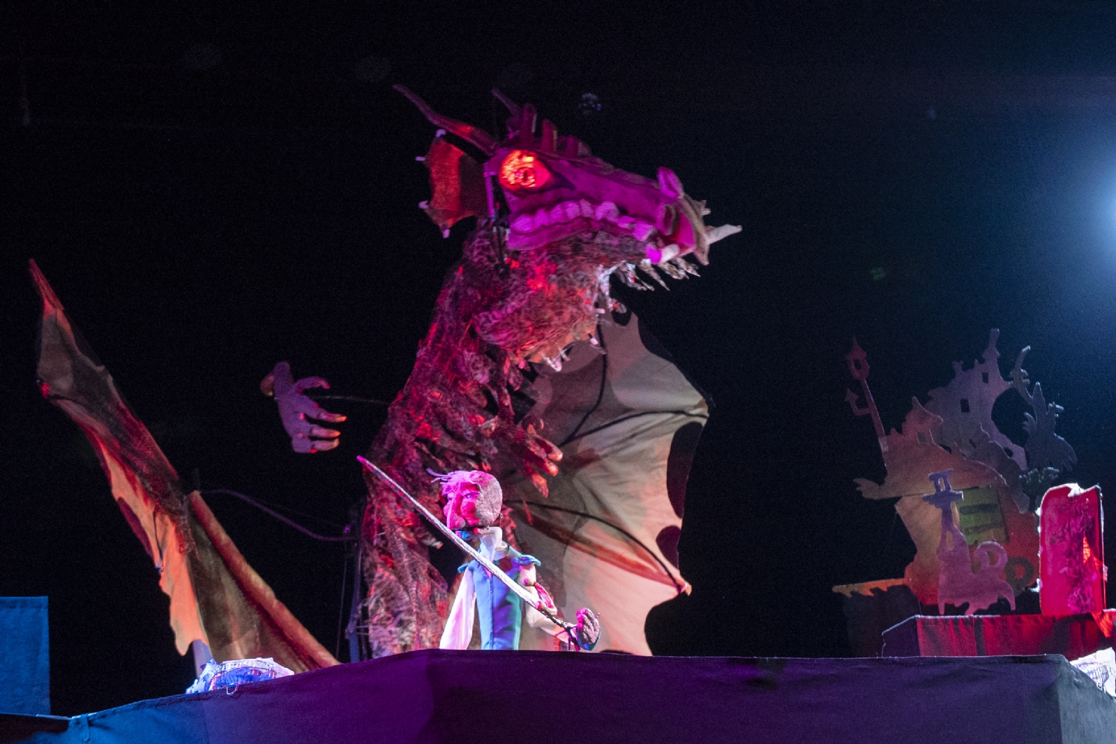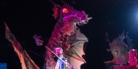 Tras el despliegue artístico al aire libre, arrancó ya pasadas las 21 hs la función inaugural de la 28° Fiesta Provincial con el grupo salteño La Faranda, que presentó para delicia de grandes y chicos la obra “Fedro y el dragón”.