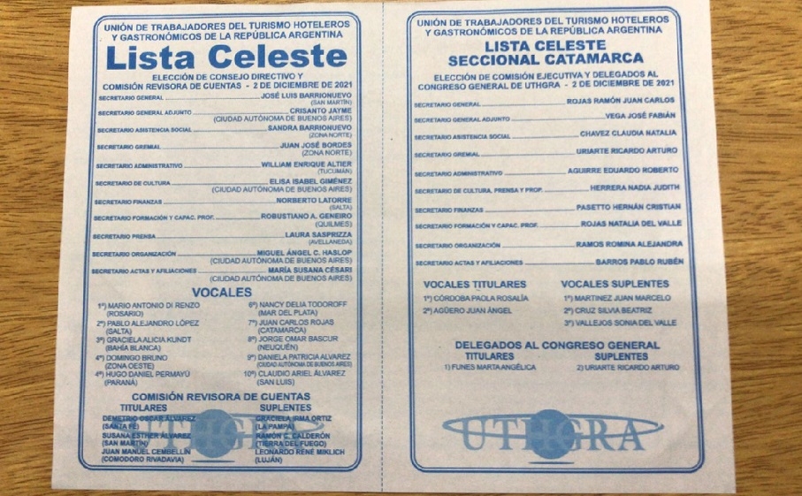 A nivel provincial, esta lista “Celeste” propicia la continuidad de Juan Carlos Rojas al frente de la UTHGRA Catamarca, junto a José Fabián Vega, como secretario general adjunto.