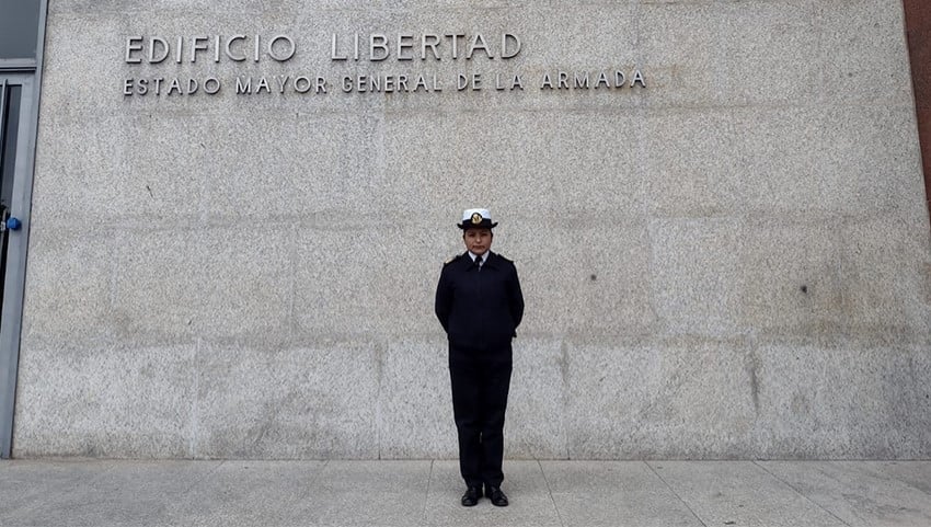 11 años después de su ingreso a la Armada Argentina, la Cabo Principal Apoyo General se encuentra de pase en la Dirección de Relaciones Institucionales de la Armada (DIRI) en el Edificio Libertad en Buenos Aires, donde se desempeña como Conductora del Comandante del destino.