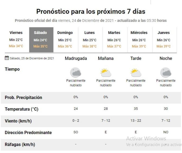 Para el fin de semana, sábado y domingo, se registrarán temperaturas mínimas de 24ºC y 25ºC, mientras que las máximas serán de 35ºC y 36ºC. Tampoco se anuncian lluvias para esos días.