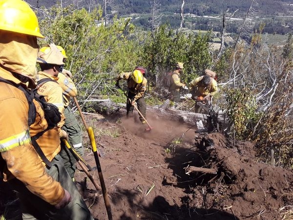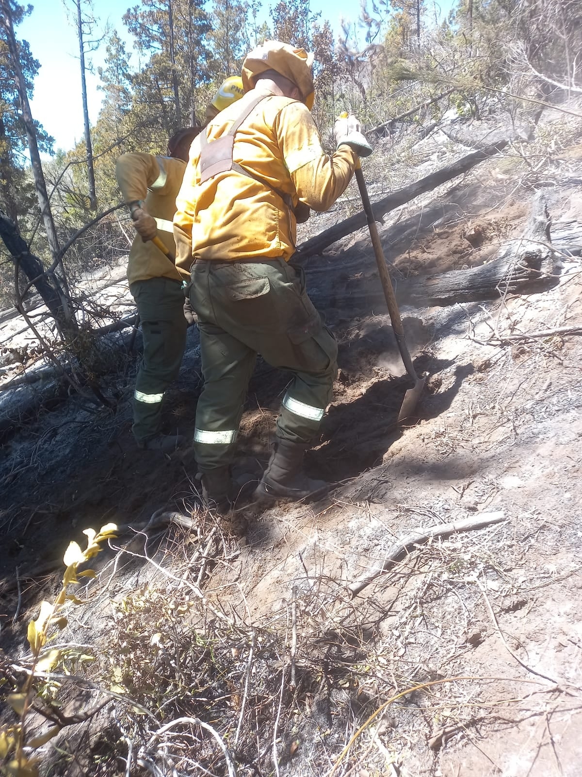En la jornada de este sábado, se trabajó en la ladera Oeste del cerro realizando construcción de fajas de aproximadamente 1,5 metros, revisión y sofocación de puntos calientes dentro del perímetro (troncos prendidos) y recorrido del perímetro del incendio.